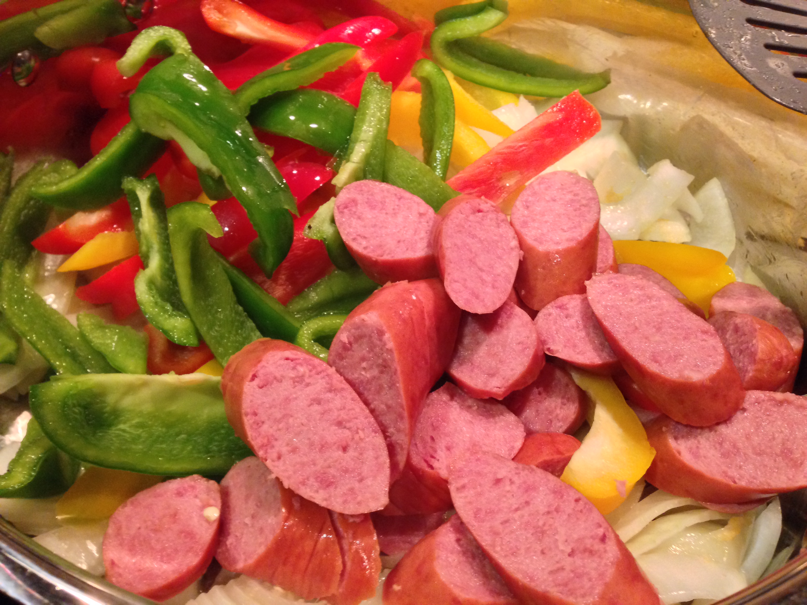 Place saute pan on medium heat and add Olive oil and Garlic to pan. Slice entire Onion intro strips. Add the onions to the pan. Let the onion begin to cook and soften. While that’s cooking, start chopping the peppers into strips. Add the peppers to the pan and stir with the onions and garlic. Adjust the heat lower if the oil starts to burn.