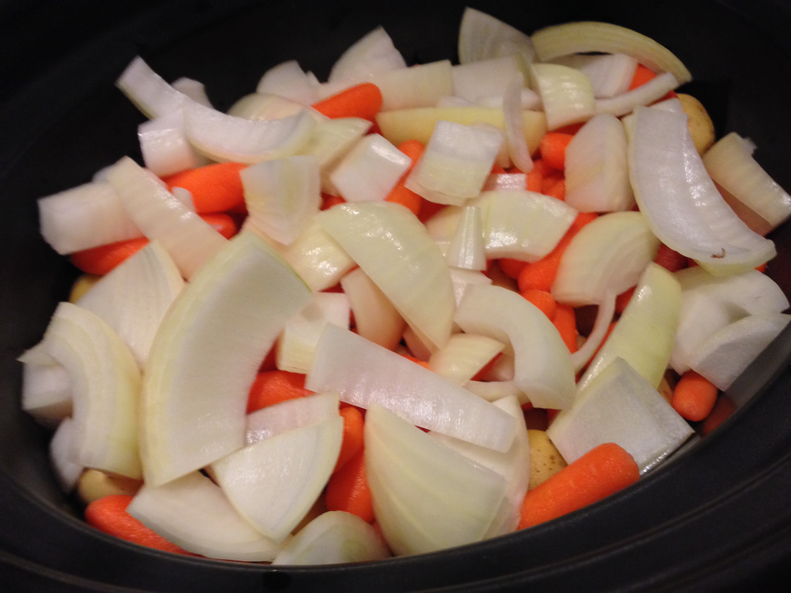 The first thing you’ll need is a slow cooker (e.g. crock pot). Place it on LOW temperature. First, chop the onion in large pieces. It’s important that the onion is in large pieces since it will be cooking for so long. Add the chopped onion, potatoes and carrots into the slow cooker.