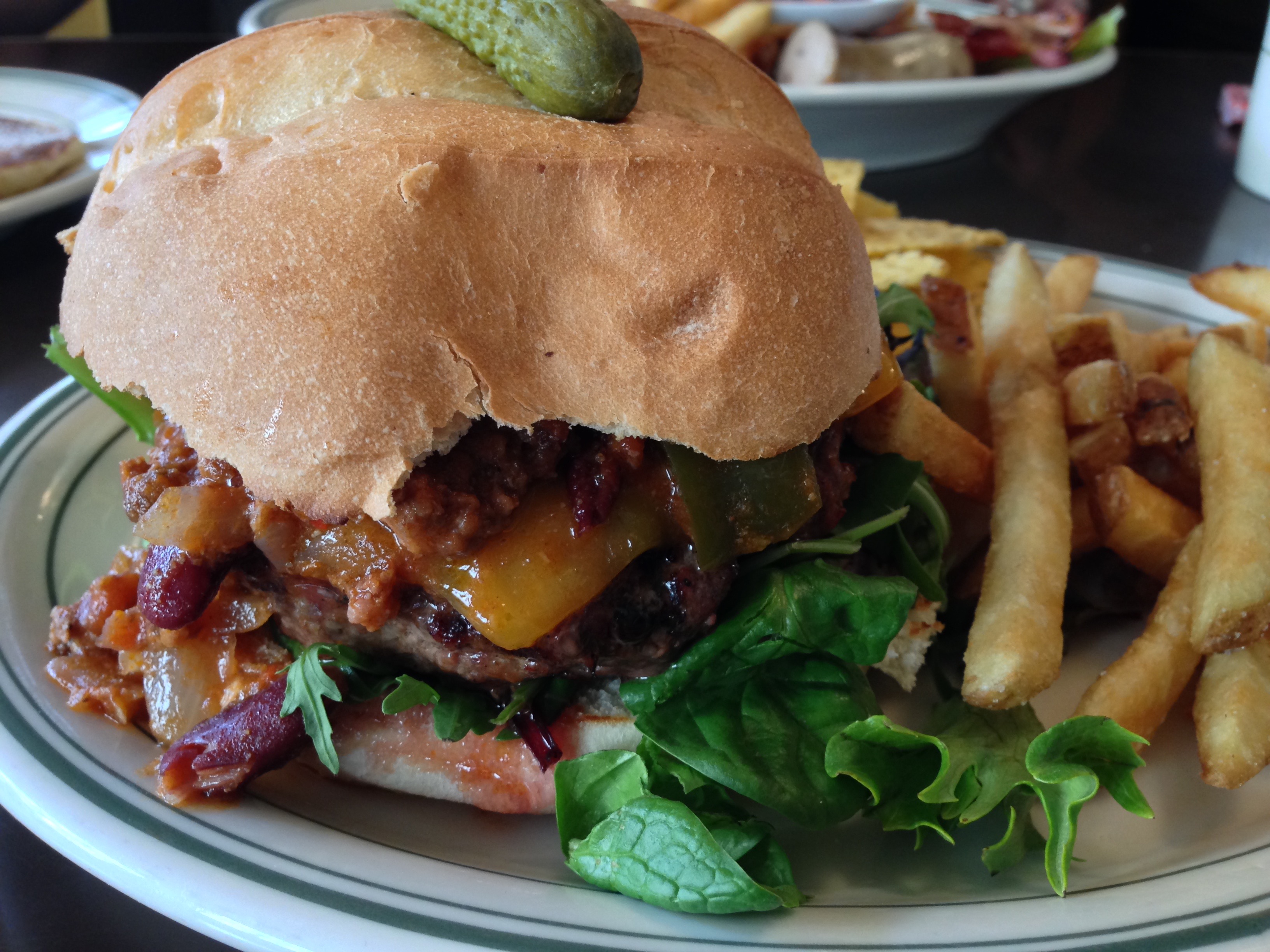 In March, we also visited the diner on a weekend for brunch.  Boy, was it packed!  You wait in a line to be seated but it was worth it.  Greg loves breakfast and I love eating so we were pretty excited for this second trip.  Greg had the Nighthawk breakfast brunch and I had the Albuquerque, New Mexico burger.  The burger comes with chili, cheese, and nacho chips – really tasty and recommended by the server.  The breakfast brunch has 2 eggs (style is your choice – Greg chose scrambled), bacon, sausage, fries, baked beans, toast and Greg optioned for a pancake on the side. Lots of food.  The baked beans aren’t necessarily an American breakfast staple but, good nonetheless.