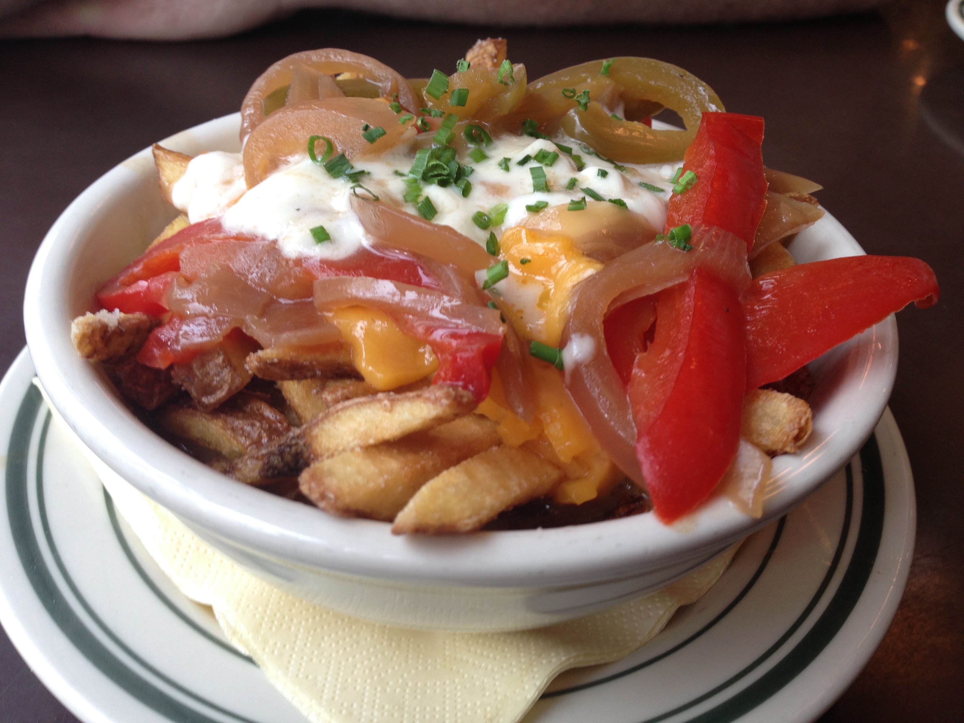Mostly recently, we went to the Nighthawk Diner for dinner.  We first started with an order of poutine.  As I understand it, this is a typical Quebecois treat with fries, gravy and cheese curds.  The Nighthawk Diner’s version of poutine also comes with grilled onions and peppers as well as a few other cheeses.  The gravy was a salty onion broth (think French Onion soup) and the cheese was gooey.  As this was my first time having poutine, I don’t have anything to compare it to but it was delicious.