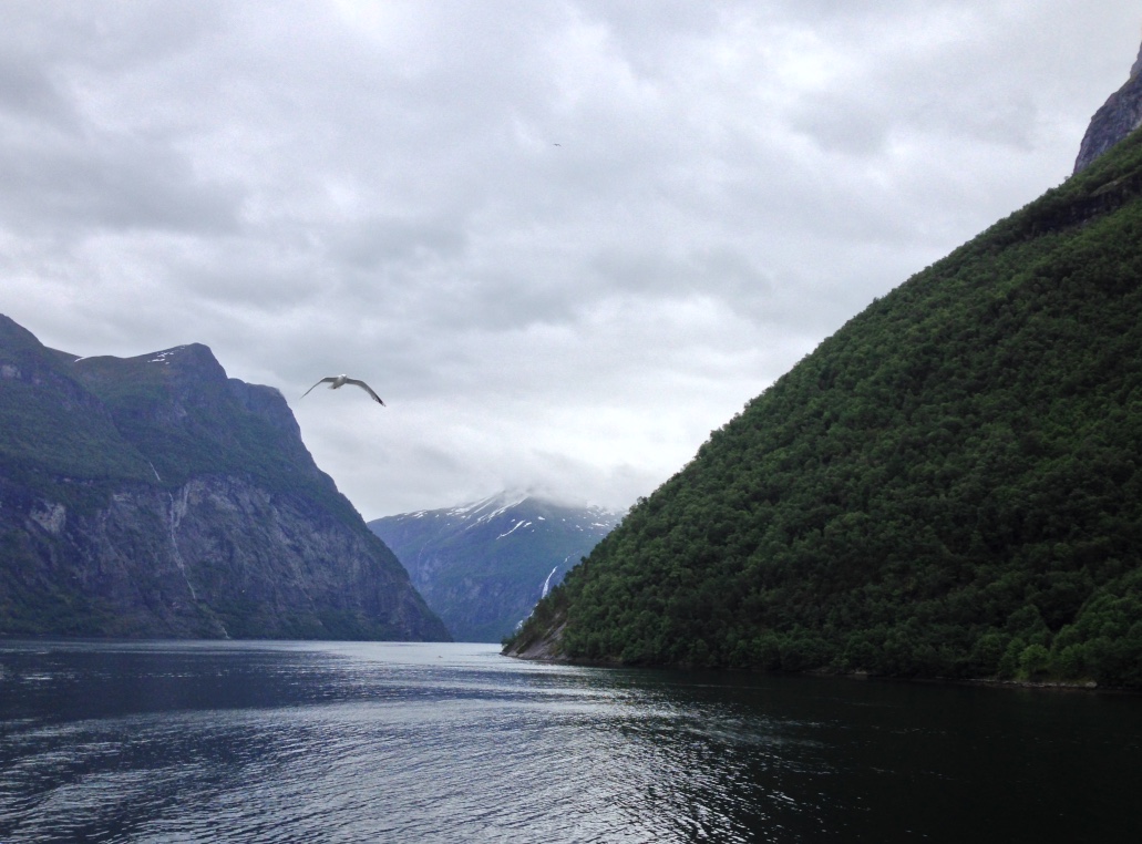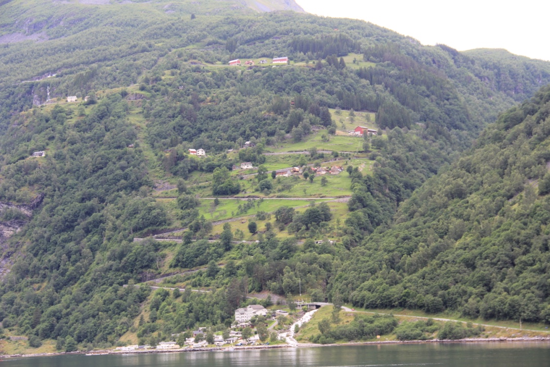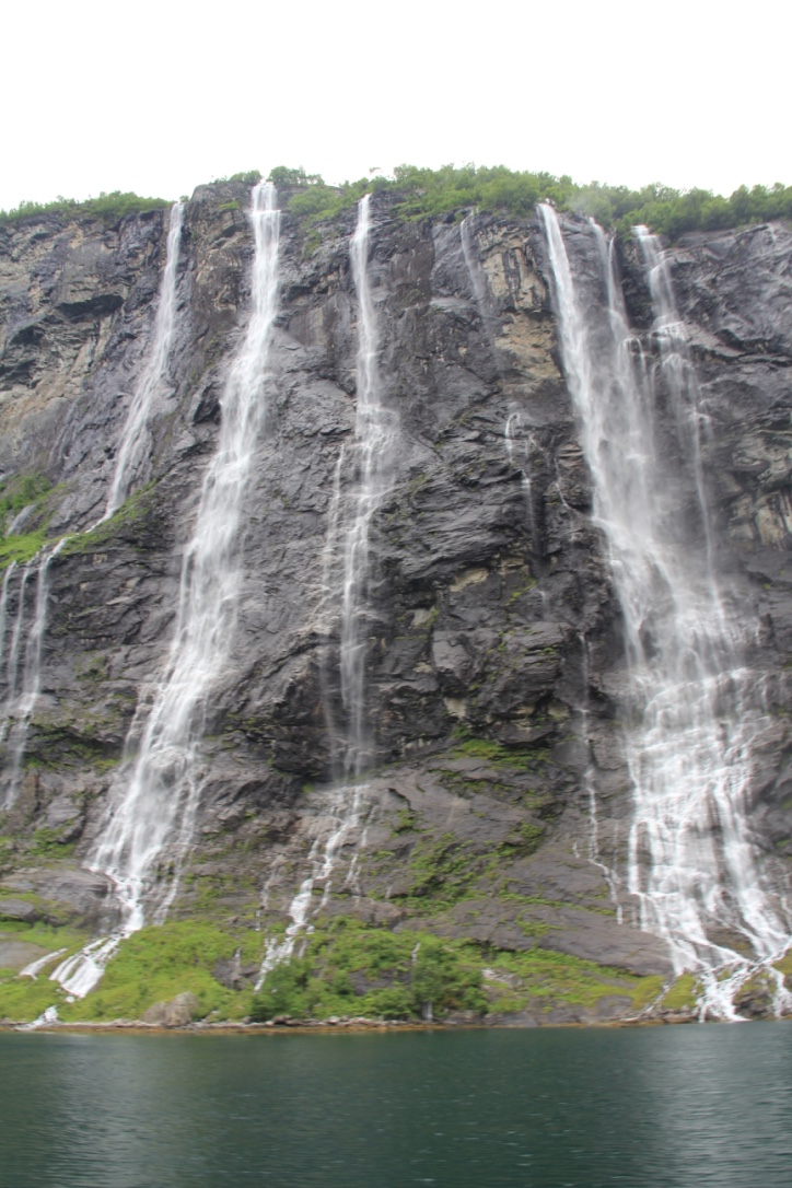 After Dalsnibba, we made our way back into Geiranger to take the car/people ferry through the fjord to Hellesylt. The ferry was amazing – a bit expensive – but well worth the trip. It was a 1 hour cruise through the Geiranger Fjord. We were fortunate to see several spectacular sites including the Seven Sisters Waterfall. According to Wiki, the seven sisters playfully dance down the mountain while the suitor (the waterfall across the fjord) flirts from across the fjord. Oh so romantic and lovely.