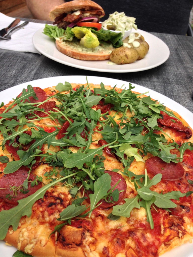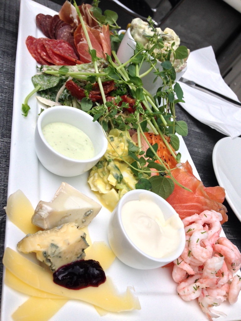We walked around a bit and then settled down to eat at the Brassierie Posten for lunch. The day was a bit breezy so we had most of the deck to ourselves overlooking the fjord. We enjoyed pizza and burgers but the real star of the restaurant was their “Plate” appetizer. It featured assorted local meats, cheeses, shrimp, salmon and salads (on left below).