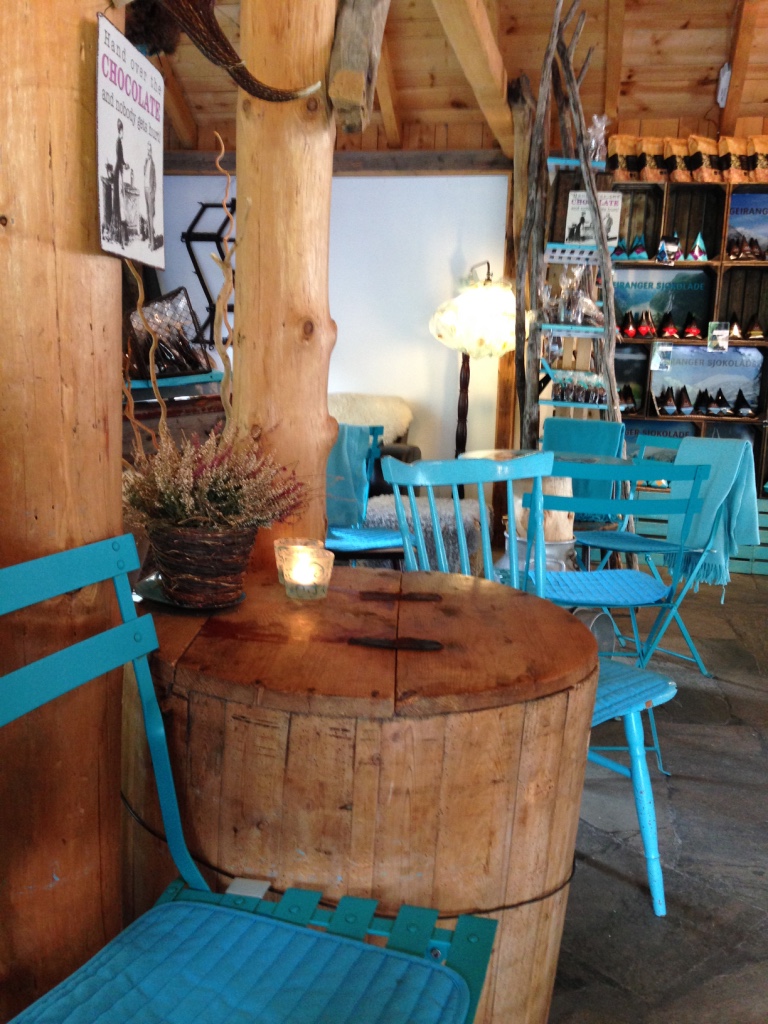 Before we got back into the car to visit the mountains, we walked about a café devoted to chocolate. So, obviously, I needed to stop in to this incredibly cute café. I had a lovely dark hot chocolate at Geiranger Sjokolade. They served the hot, frothy milk with dark chocolate on the side to mix into the mug. The server assured me that if I needed more chocolate, he would be happy to provide it but this amount was perfect. Lovely drink before our head into the snowy mountains.
