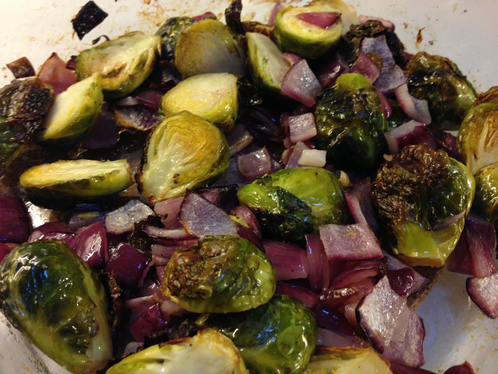 Sprinkle the top with salt and pepper to taste. Now put the casserole dish into the oven. Roast vegetables for about 20 minutes or until you see the leaves of the brussels sprouts begin to crisp and onions look cooked. You can even turn the oven up a bit (425 degrees) for a few minutes at the end for the final crispness. I prefer them a little burnt even… like this: