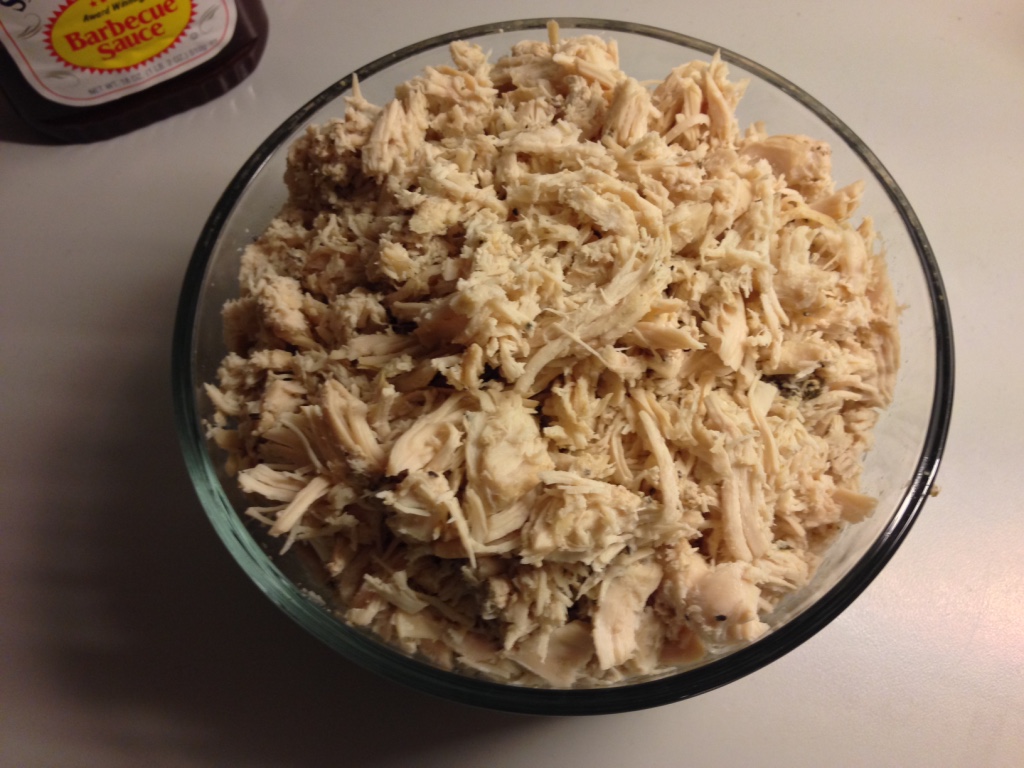 After shredding all of the chicken, add the BBQ sauce and mix. This will give you lightly sauced shredded chicken. If you prefer more sauce, please feel free to add.